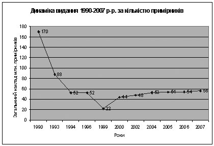 | 1990-1996 р-р. Гіперінфляція, економічна криза. | Падіння виробництва за тиражами у 3 рази. |